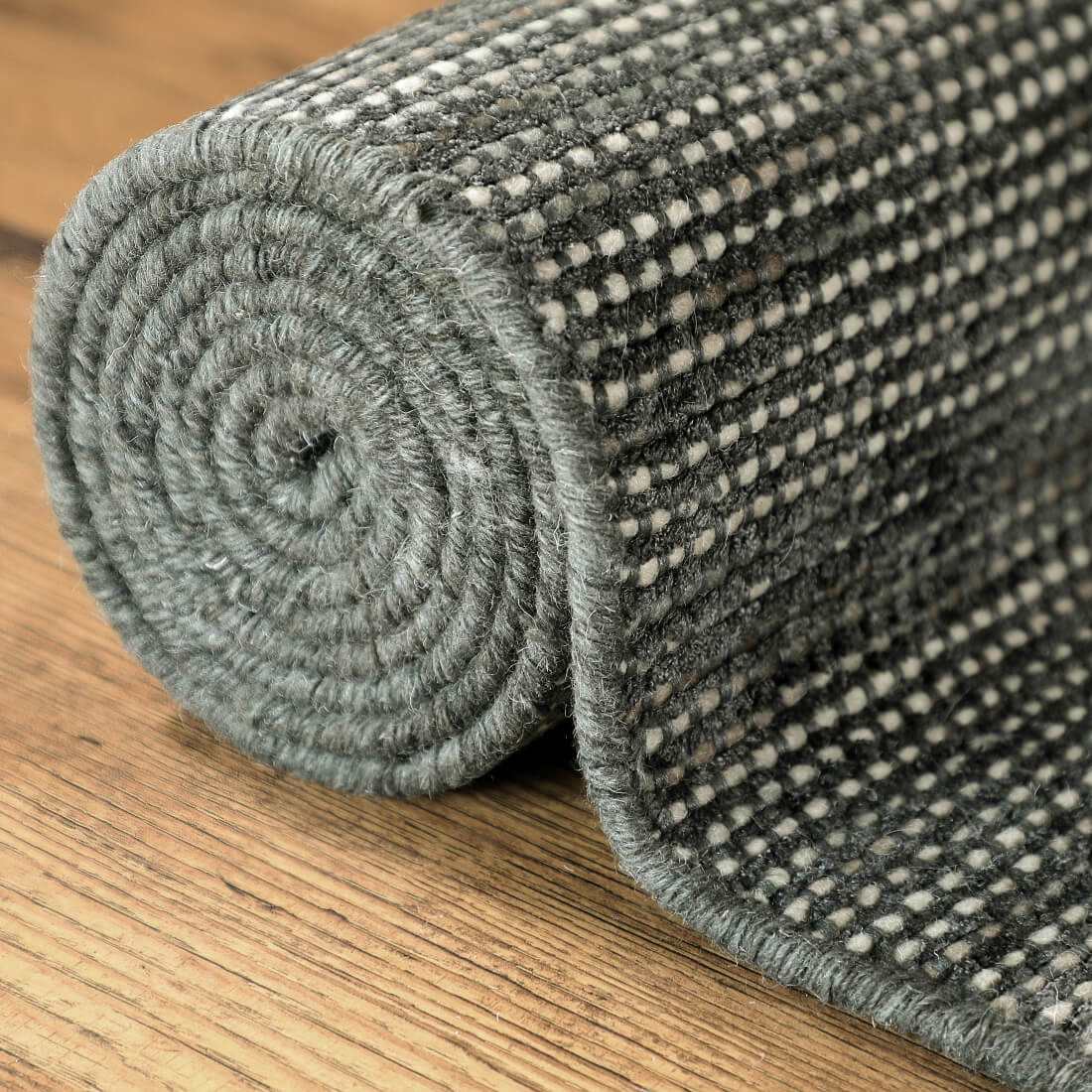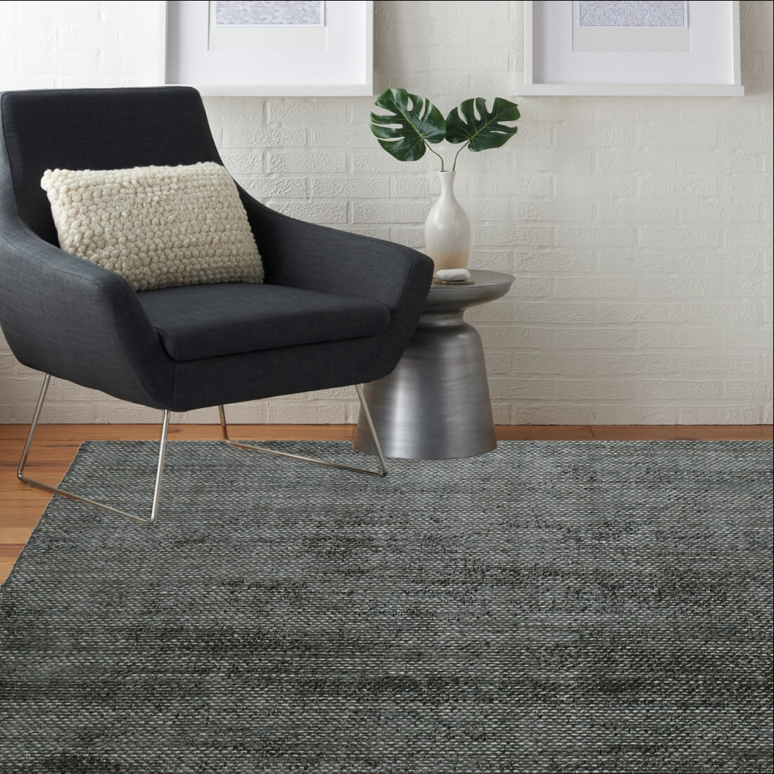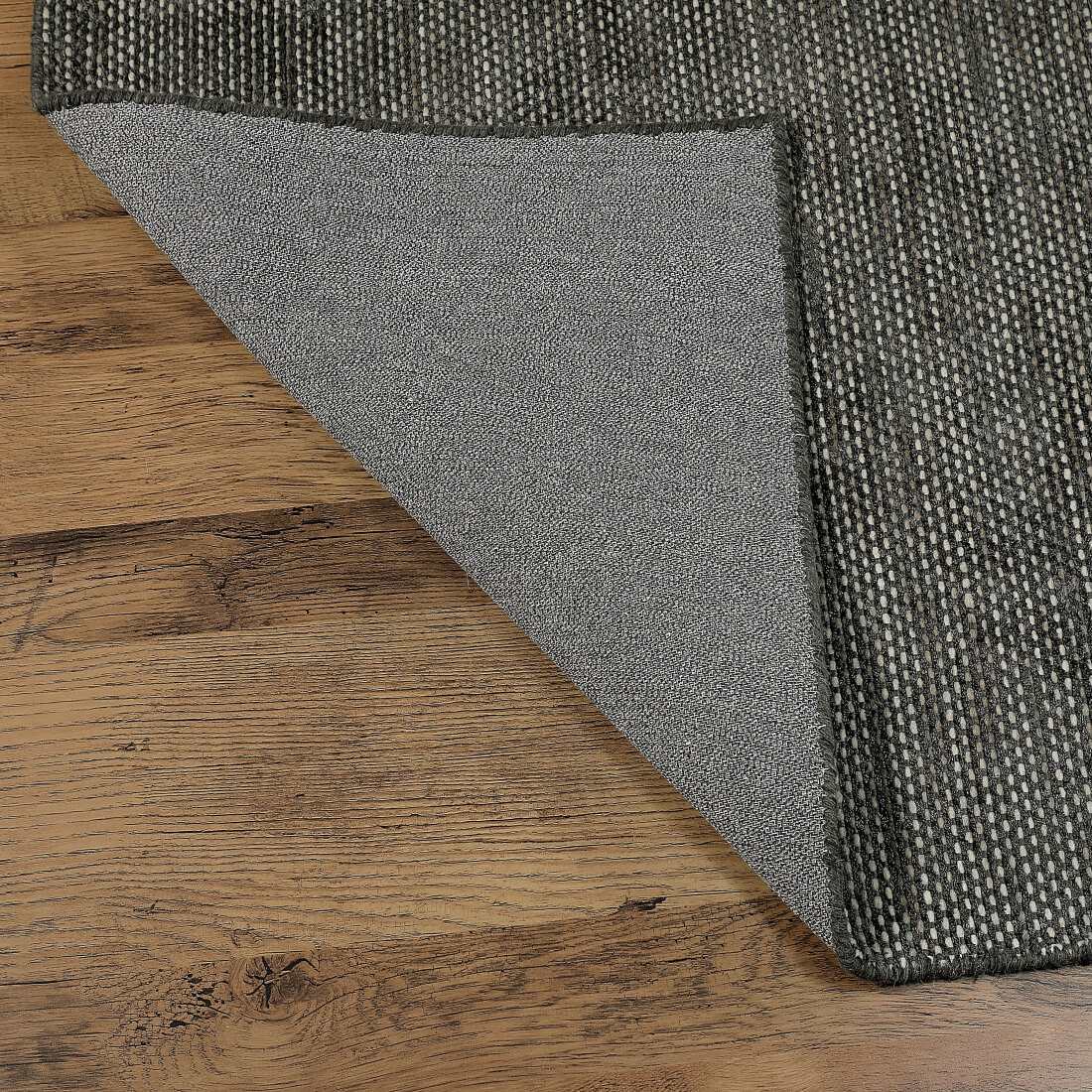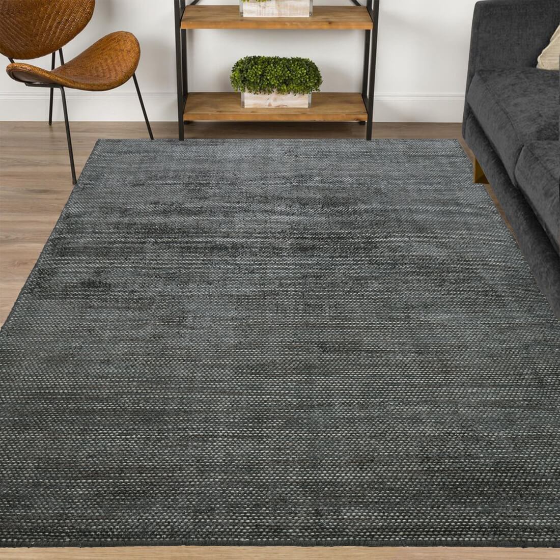 The Noir Handloom Rug, crafted from wool and viscose, features eye-catching space-dyed accent yarns that elevate monotone hues with depth and richness. Its striking design adds exquisite grandeur to your living room, enhancing both style and sophistication with a luxurious, bold touch.